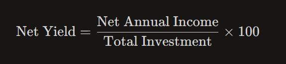 \text{Net Yield} = \frac{\text{Net Annual Income}}{\text{Total Investment}} \times 100